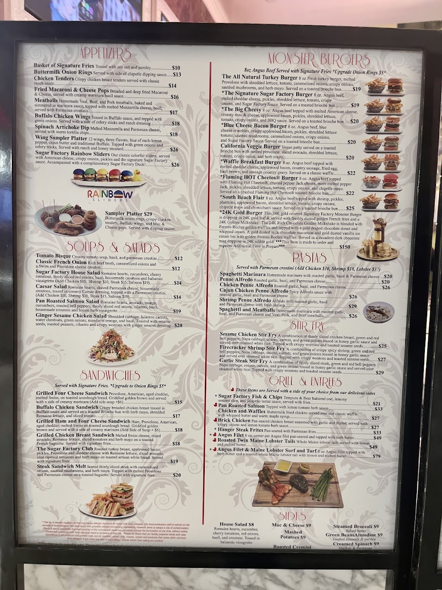 From the moment you step inside, you are welcomed by a kaleidoscope of colors and creative designs, perfectly reflecting the playful spirit of the Sugar Factory brand. Customers rave about the vibrant presentations and delightful combinations of flavors, making it a feast for both the eyes and the palate. Each dish, whether it’s the famous Belgian waffles or the innovative mac and cheese pops, is crafted to ensure that every bite is an experience to savor.